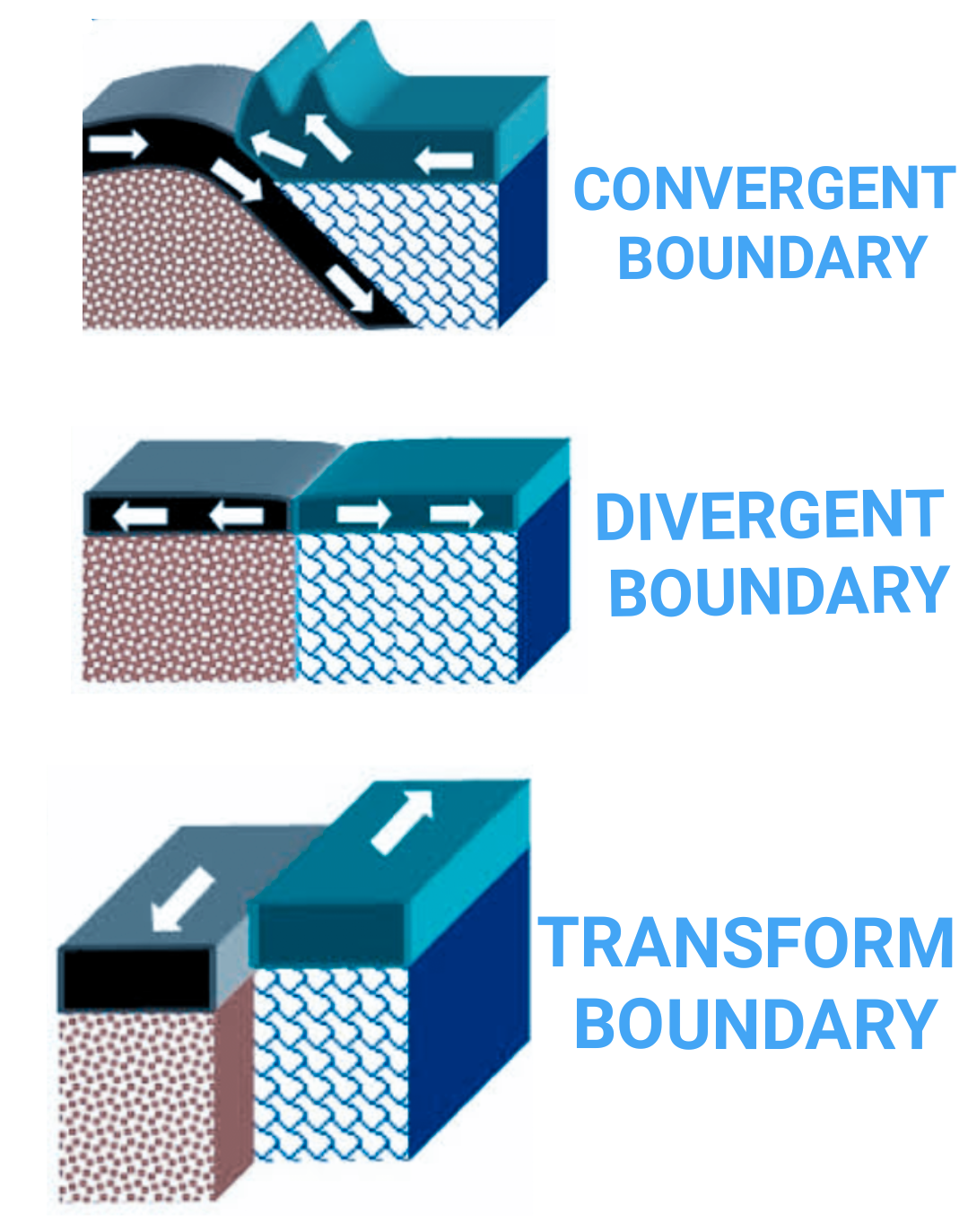 These three types inter-plate interactions are called the convergent, divergent and transform boundaries.