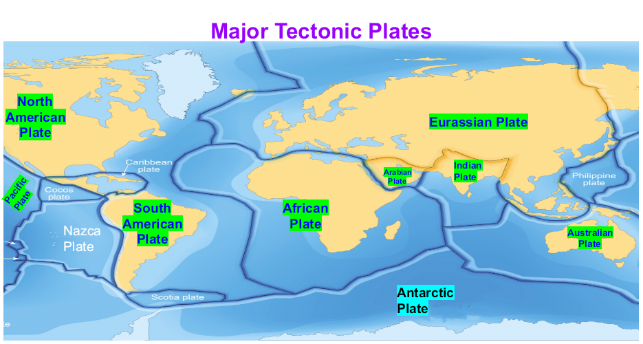 The surface of the earth consists of 12 major tectonic plates, 20 smaller tectonic plates and many filler plates. The major tectonic plates are the Indo Australian plate, the Eurasian plate, the African plate, the North American plate, the South American plate, the pacific plate, the Antarctic plate, etc.