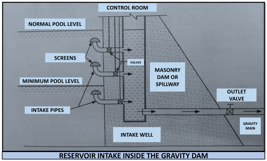 In the case of gravity dam (RCC or masonry) intake tower is constructed inside the dam itself and only entry ports or intake pipe are provided at various level as shown in figure.